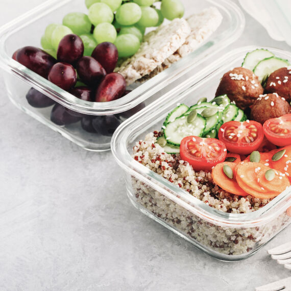 Wenn du deine Mahlzeiten nur für den jeweils nächsten Tag vorbereitest, brauchst du im Grunde nur eine gute Transportdose. Ob du dafür ein Schraubglas, eine Plastikdose oder eine spezielle Lunchbox nimmst, ist eine persönliche Entscheidung. Der Behälter sollte auf jeden Fall zuverlässig und aromadicht schließen, damit die Tasche sauber und der Geschmack erhalten bleibt. Eine Transportbox aus Glas hat den Vorteil, dass sie sich gut für die Mikrowelle eignet, Dosen aus Kunststoff sind dagegen leicht und unzerbrechlich. Übrigens: Meal Prep kannst du saisonal machen – einfach nach unseren Saisonkalender für Obst und Gemüse einkaufen und gelegentlich auf vegetarische und vegane Alternativen zurückgreifen.