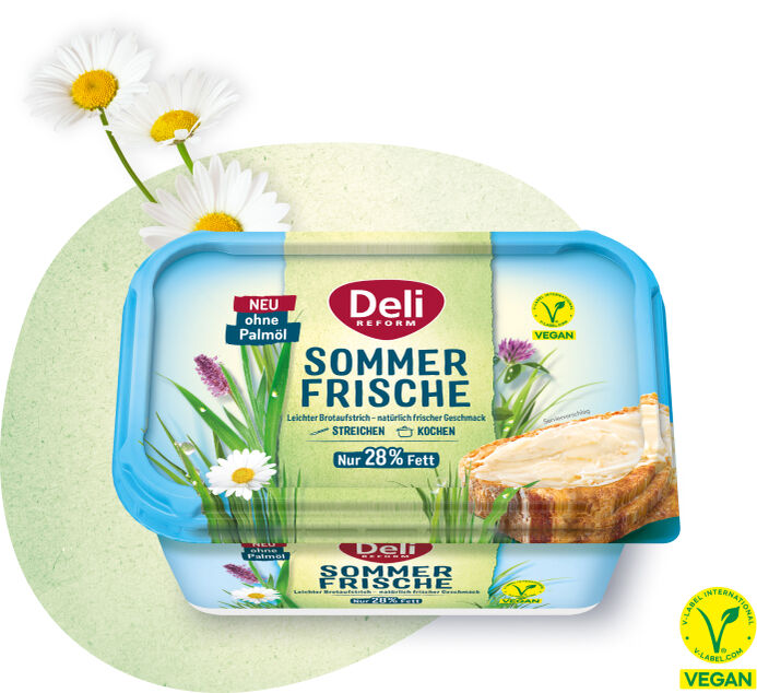 Deli Reform Sommerfrische hat nur 28 % Fett, wird aus rein pflanzlichen Ölen und Fetten hergestellt und enthält natürliche Omega-3-Fettsäuren aus hochwertigem Rapsöl.